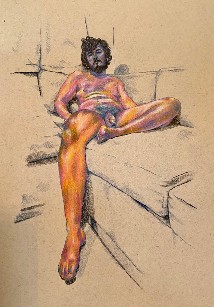 So what did I do. I told my partner to pose like one of those classic nudes, multiple times. In Blackpool I found a book on paintings from Milan and another from Venice. There were a lot of female nudes by male artists, but not a single male nude by a female artist. I am nothing if not able to entertain myself. My partner became the Haven Caravan nymphs. I figured he too could have the chance to be sexualised. To become the object, to have his body used for my artistic endeavours.
