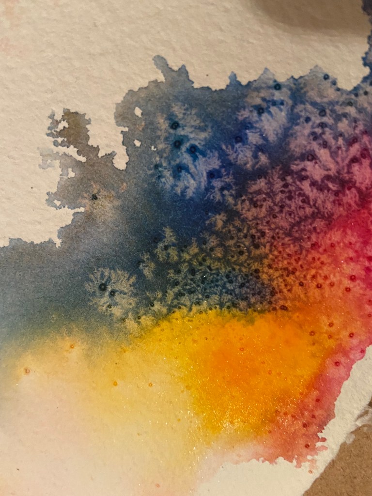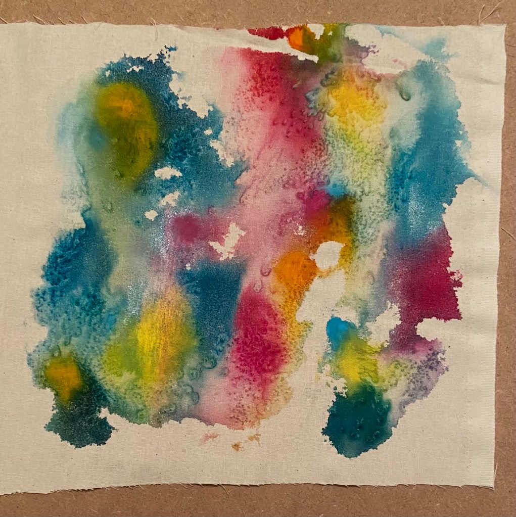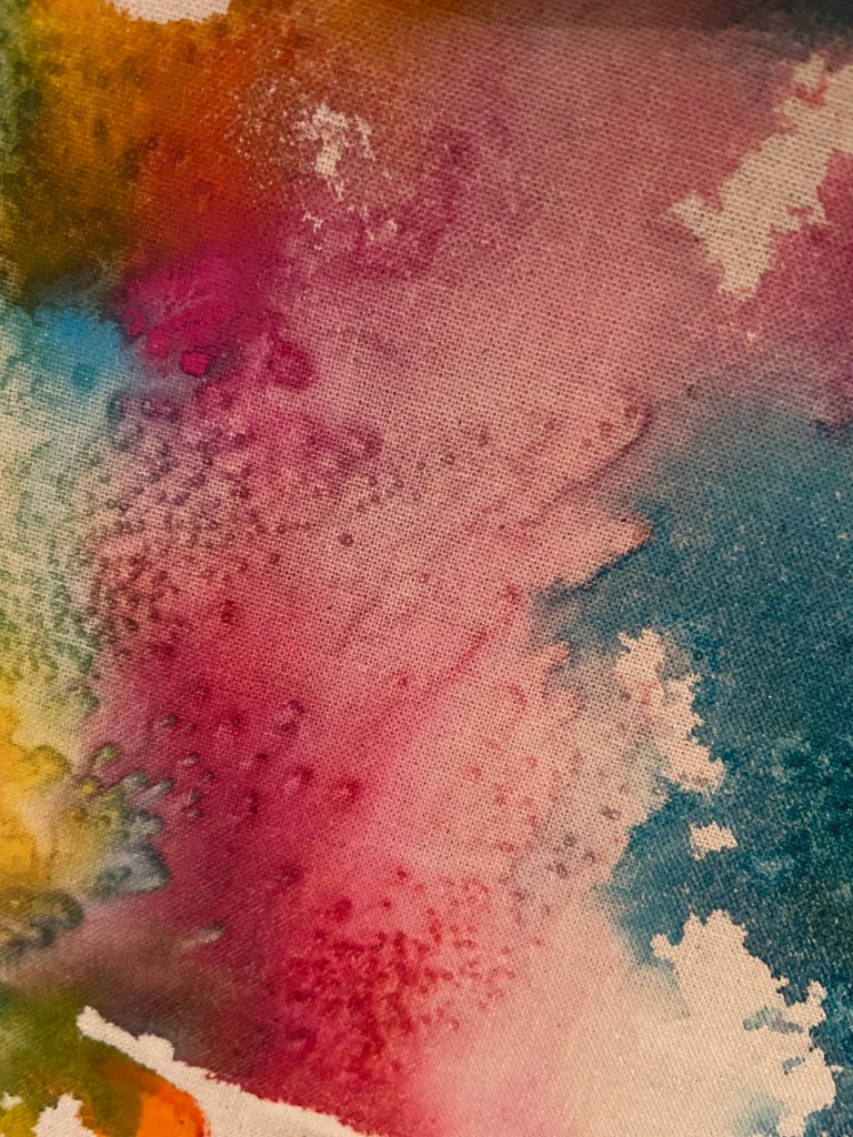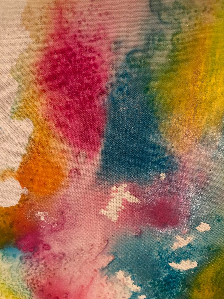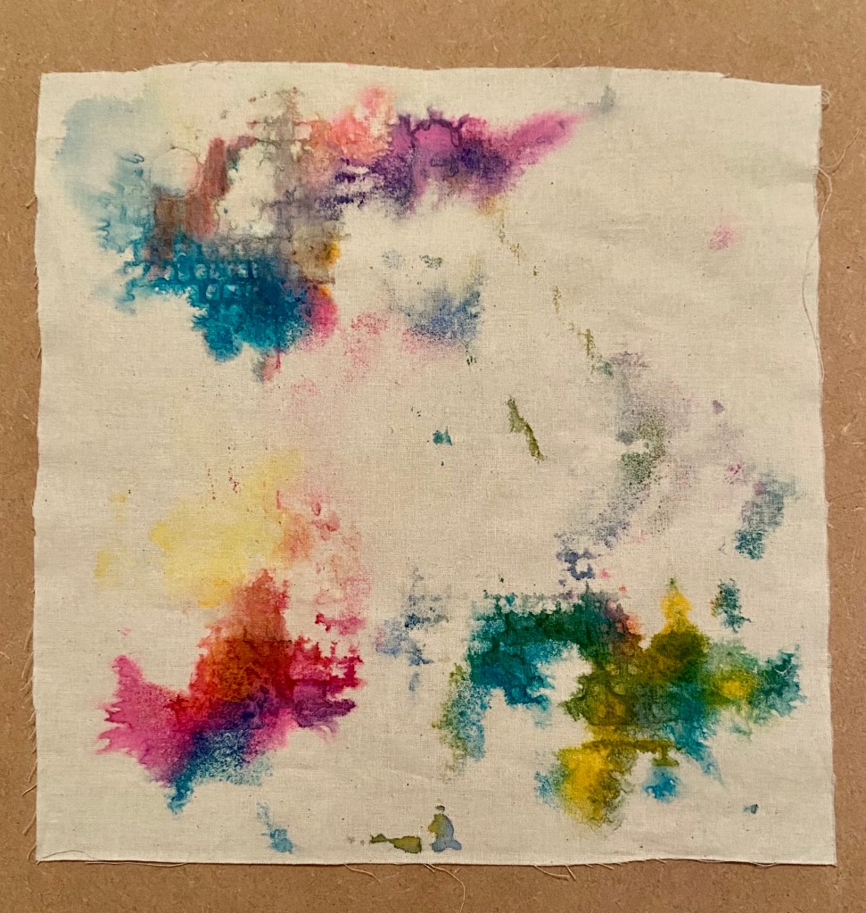 I was working on something I wanted to look quite ethereal so I first sprayed the surface of an acrylic offcut with water, then dropped the ink on, then wet the fabric, or paper and then placed it over the fabric. When you have done this you can add salt to make starbursts. There are other things you can splash on like bleach for other effects. You don’t really know how it will turn out. You could ruin the fabric, place it badly, muddy it, leave no white space, barely pick up and colour. I must like it though because in one form or another I have always done this. I love color. It brings me joy. I need colour and distraction and fun.