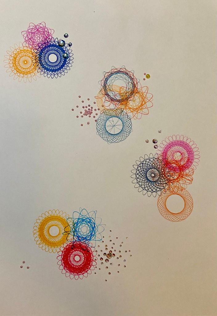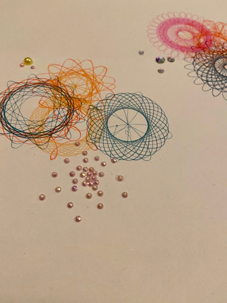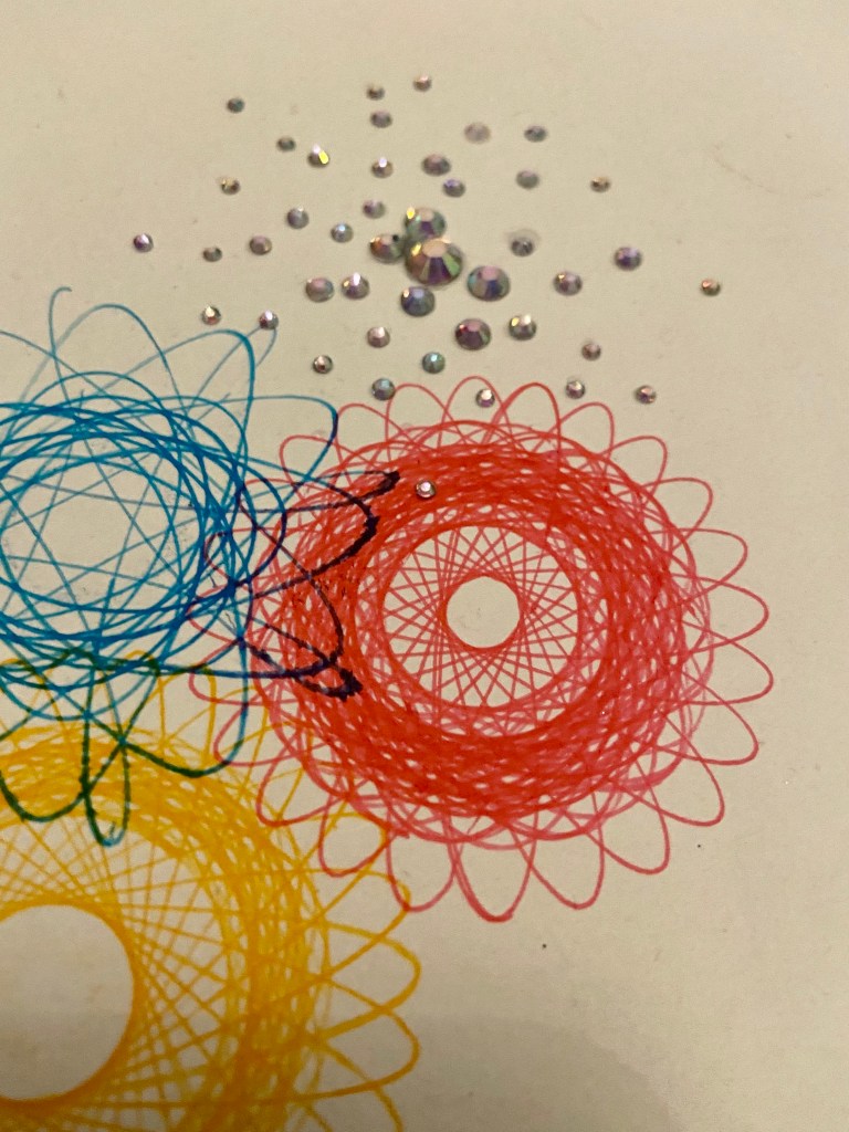 I don’t know where I am going to go with them next but I have been playing with adding sparkles. Everything I do is usually symbolic of something. I think that why I like semiotics so much. The spirographs are now ADHD, the shapes are childhood, the sparkles are covering the sadness and bad things etc.