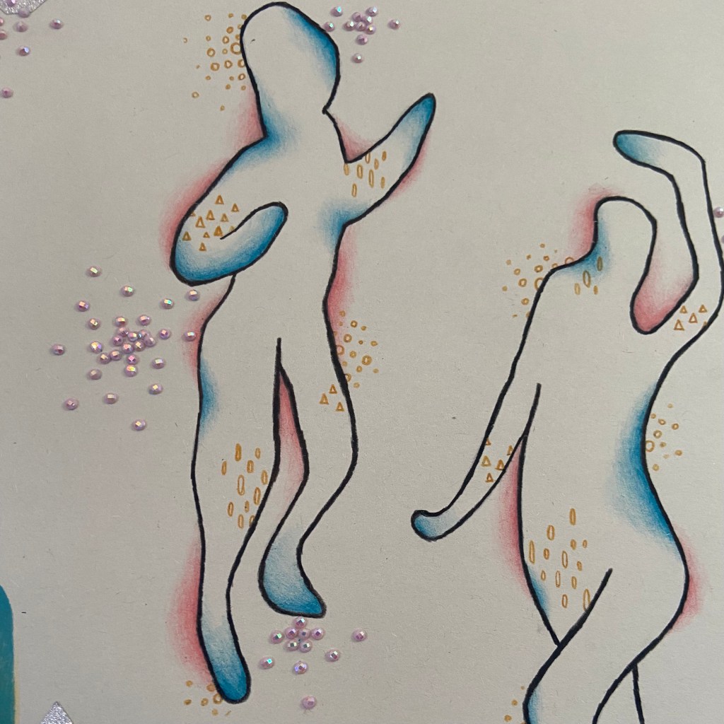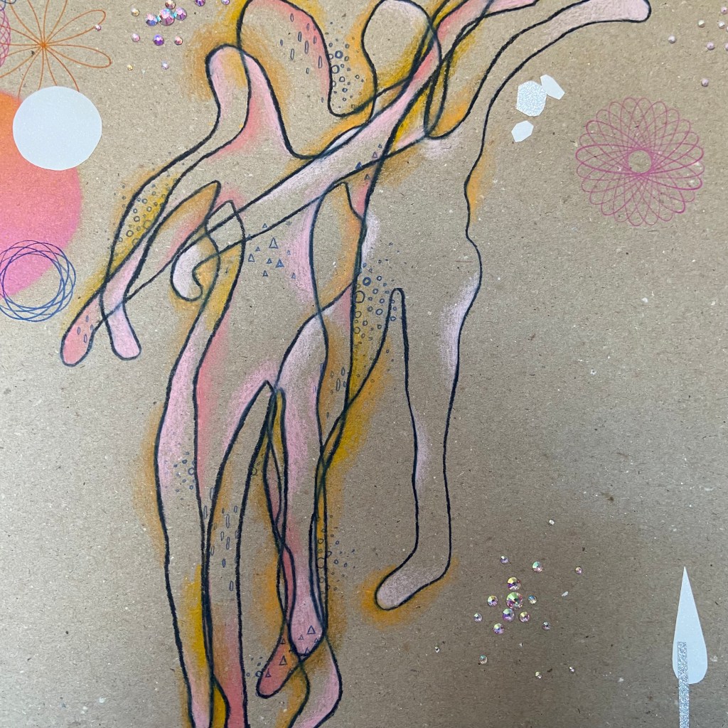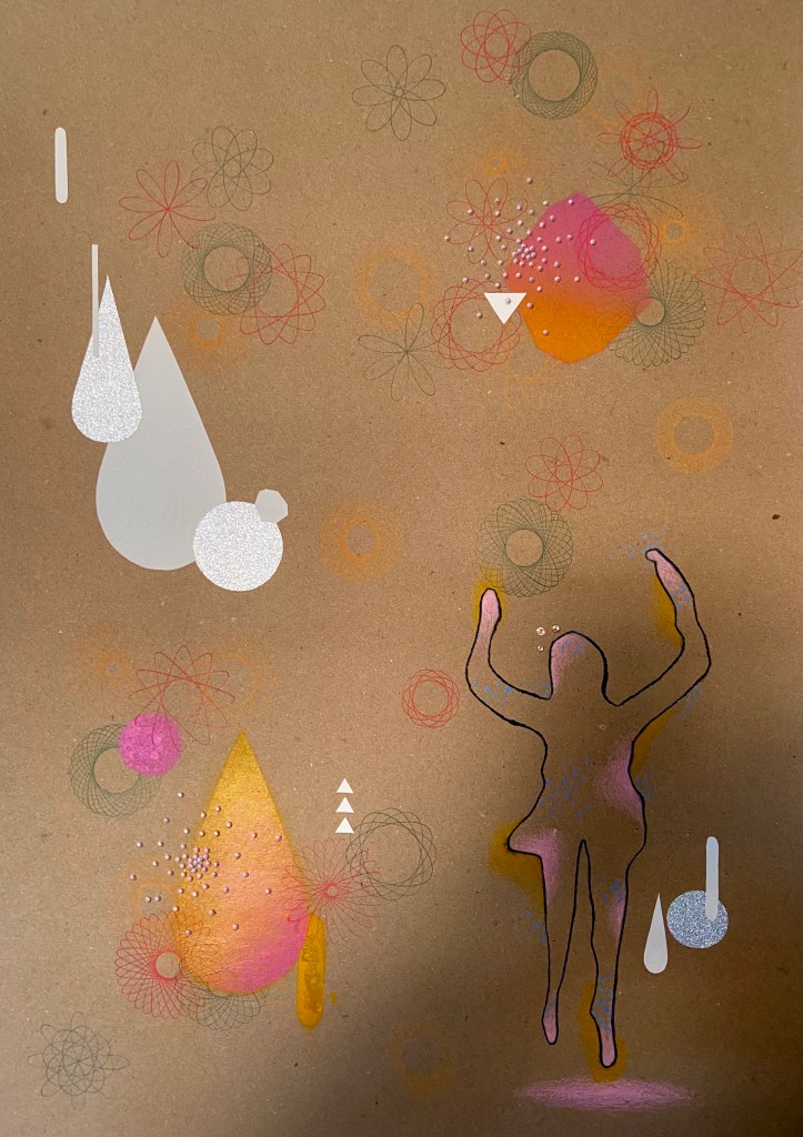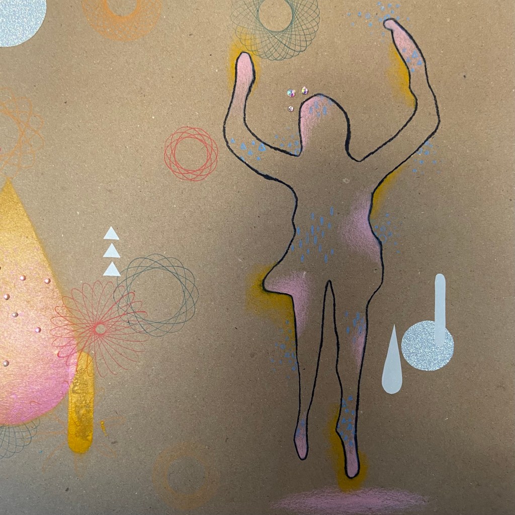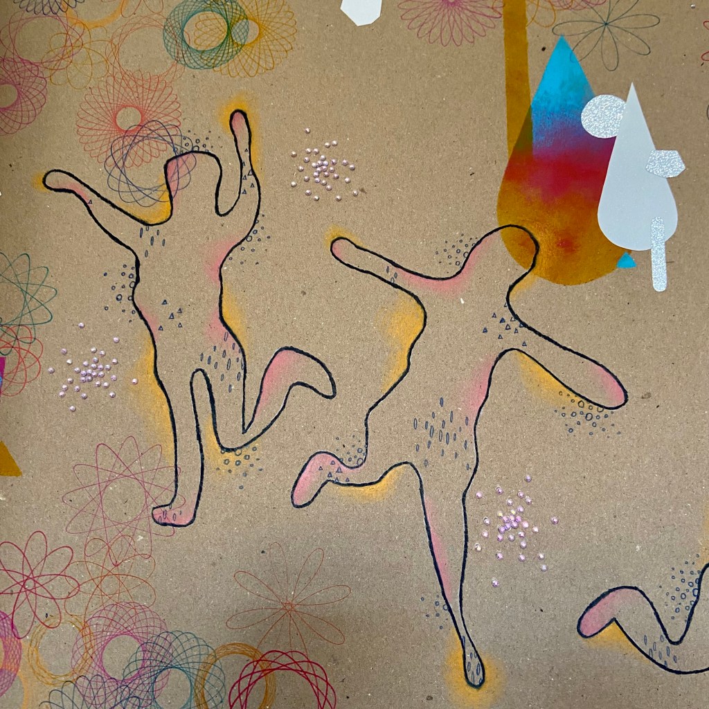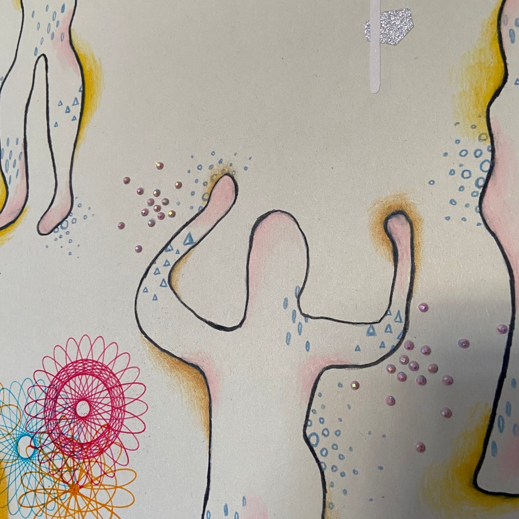 The spirographs were a bit repetitive. Trying to get variety in such a small set. I think the figures offset them for me and gave me chance to be a bit less restricted and methodical. I could have ruined the whole piece with the figure as I just added them at the end. The could have been aweful or not fit but I had to put myself dancing and jumping and working the bad feelings out of my body in there too.