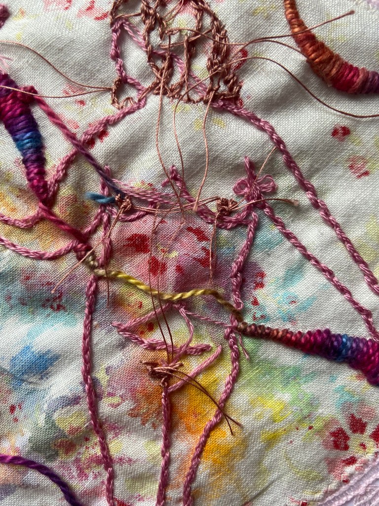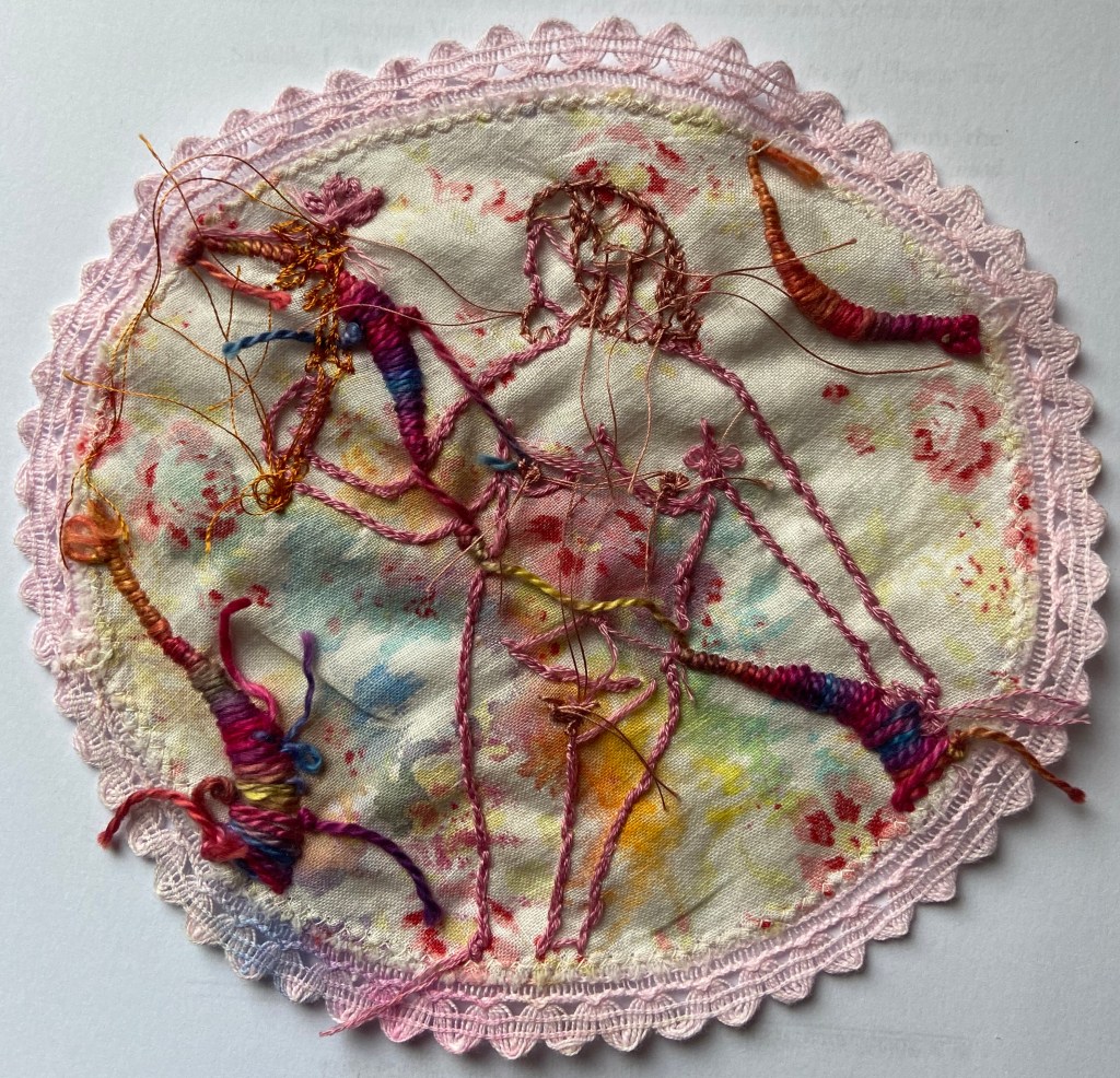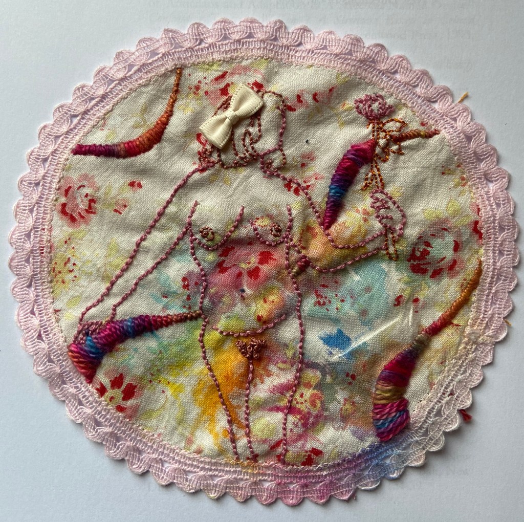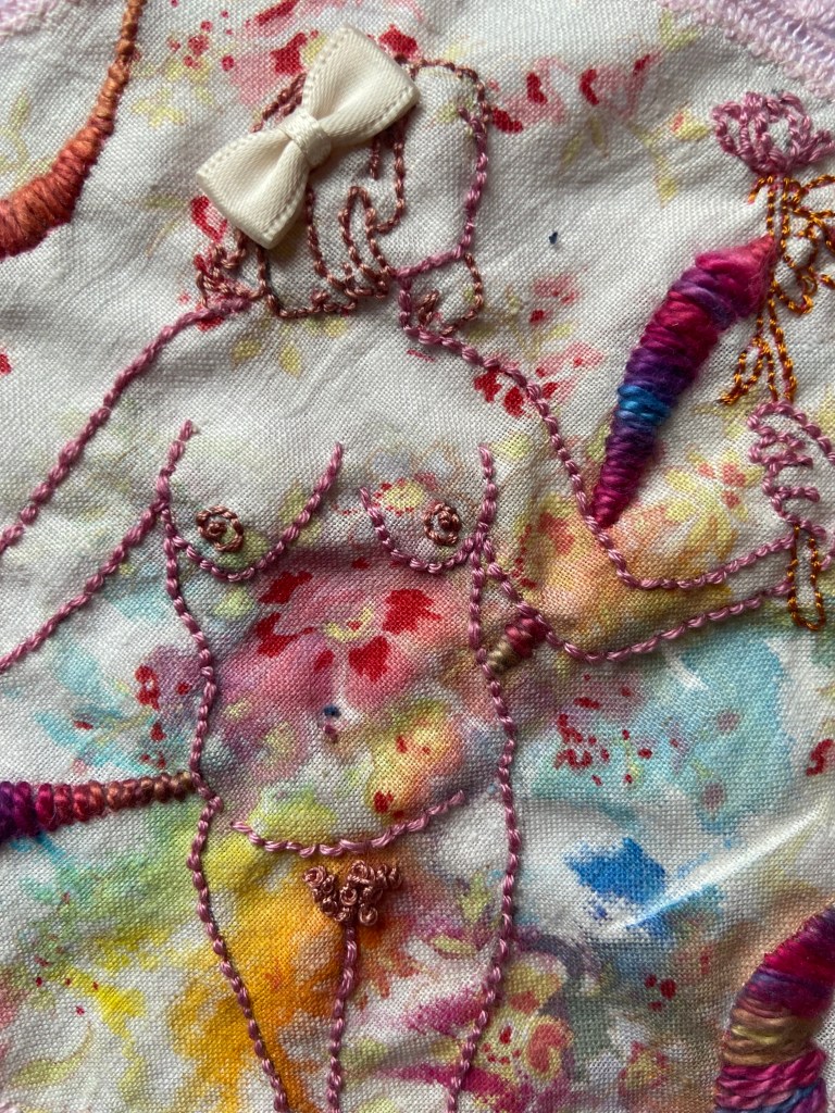 I actually forgot I started this and found it half done. Way back when some dude had a go at me for having arthritis and not moving fast enough and then the next day I was called narcissistic for using my own body in my work I made this because I thought it was ironic I was assumed to think so much of my body when it just bothers me all the time, it’s always in some kind of pain, letting me down, being judged. I definitely don’t think highly of it, or particularly lowly, it’s just the only body I have free and easy access to. I figured I would make myself a goddess even if just in embroider, on a napkin. It didn’t work very well. The pattern and inks are distracting. It’s just one of those projects I did loads of prep for, photos, inking, sourcing the fabrics, sketching, choosing the threads, and then lost interest in when I didn’t love it. I think I was also doing other things I loved more. I actually like the back of it better. Maybe I just forgot what the point of it was. I try to just walk away when things arent sparking joy. I did sketch out another one so I am going to do that on the machine as a test for more detailed work so at least it wont go to waste. I might use the other photographs to do some work on paper as I miss drawing and experimenting.