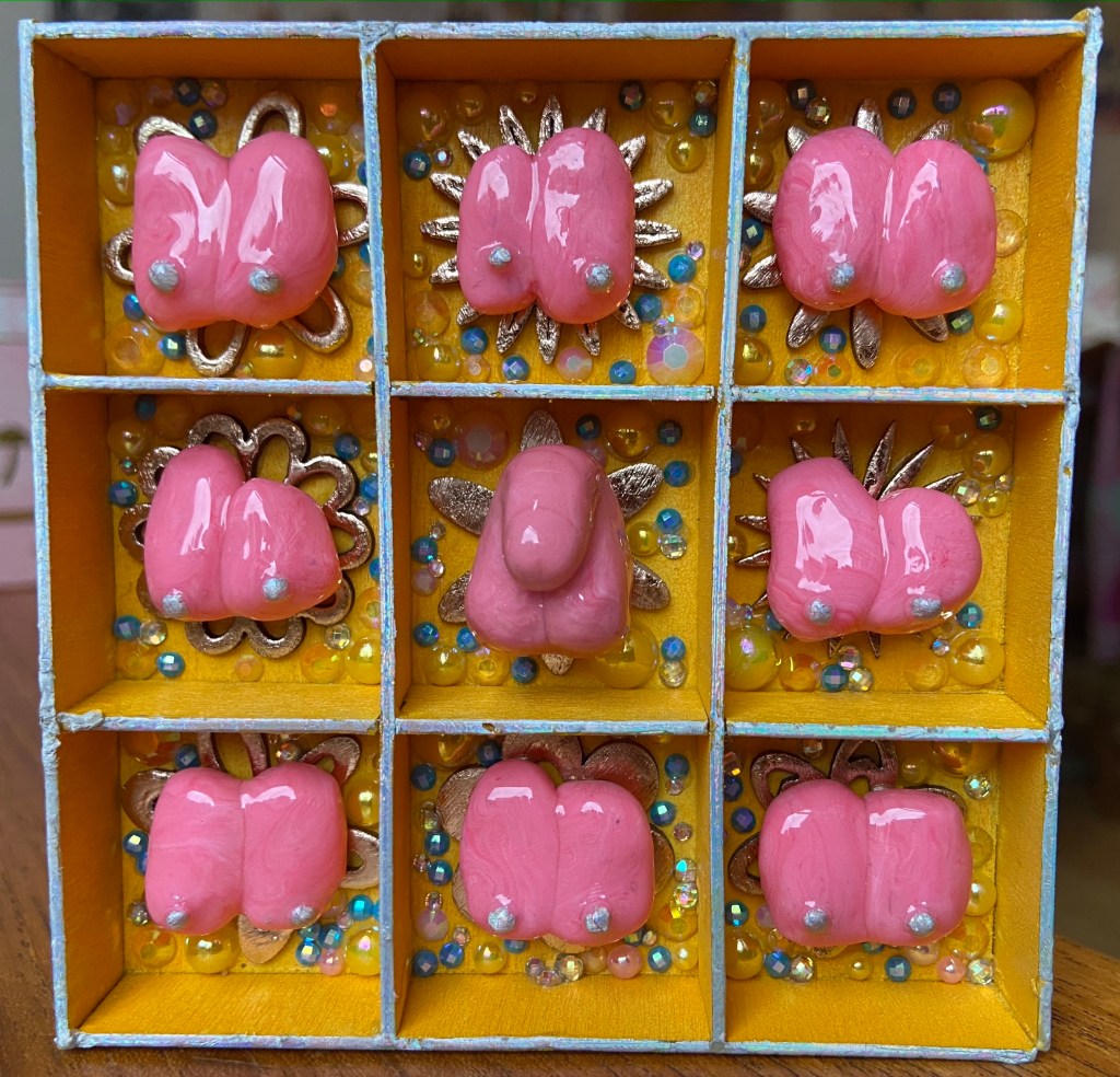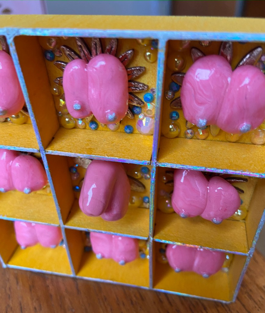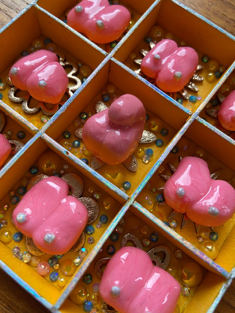 I may have gone a little off track over the Christmas break. I made a little tits and cock display with sparkles and nail foils. I used nail gel gloss and cured it with UV to make them glossy and mounted them on golden flowers. I rushed it a little and cold have got the nail foils a bit better pressed. They would have been more iridescent that way. If I was to make another one I would push it even furthur. More sparkles and foils and glossy things. I love it. It’s everything silly about gender and these symbols that are supposed to mean so much.