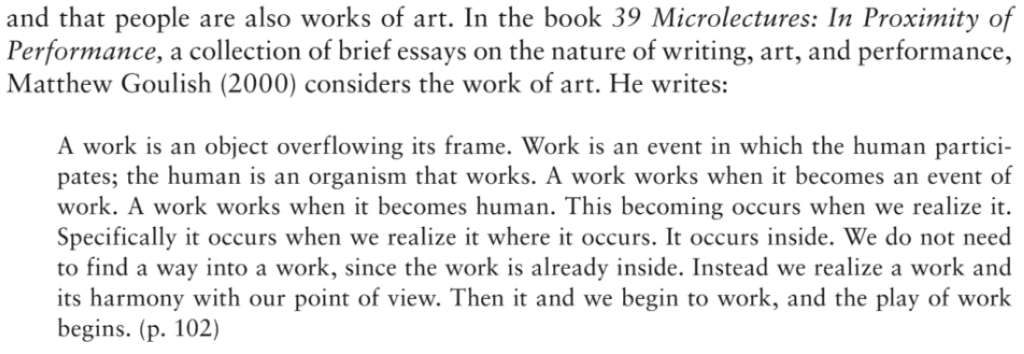 It hurts to think Jonathan of all people would think I used these terms just to sound clever or because I thought they sounded good when they mean so much to me and my practice, when finding them, with each and every one, I felt a sense of being seen and understood, of being part of something, of no longer being alone in the way I think. I thought I was being clear and that what I was relating to in my work was obvious. On the first 1:1 I am asked if it needs to be clear and I figured no it didn’t, then on the second 1:1 I reach the roadblocks of not making things explicit.