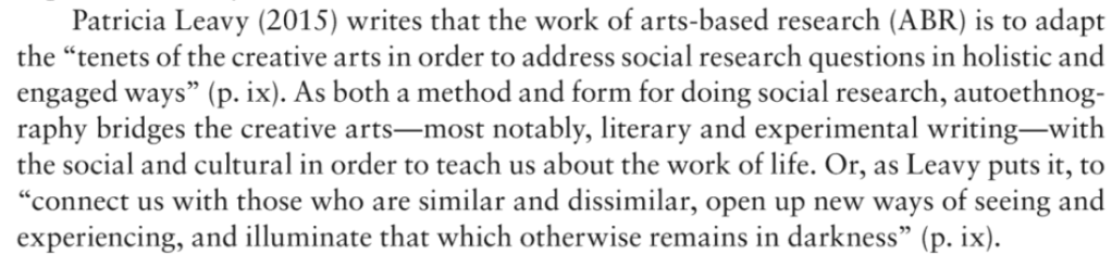 Autoethnography explanation – I use the term autoethnography because it fits the way in which I use my own experiences and what has happened to me and my lived experience as a woman and my inner self and filter it through the work and the things I make to process how I relate to them. I have mentioned many times that I see myself as using my own life and my own experiences as a way of exploring the way in which society treats women and as a way of expressing what it feel like to be treated certain ways by society. I explore feminism and womanhood and all the other things that affect me through my own experience and express it within the work. I saw Autoethnography as something that I am doing weather I assign that term to it or not, but that in using myself as the research subject it would progress my understanding and practice and also offer some sort of guidance if I was to use the term and hold myself accountable to understanding the field of autoethnography better. I have spoken in previous posts about making the invisible visible and I see autoethnography as a process by which this can be achieved by looking at what I am expressing and why and how and how it relates and interconnects with my own and others reserch. The following are some excerpts from The handbook of Arts Based Research by Patricia Levy (2017)