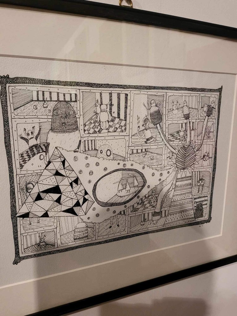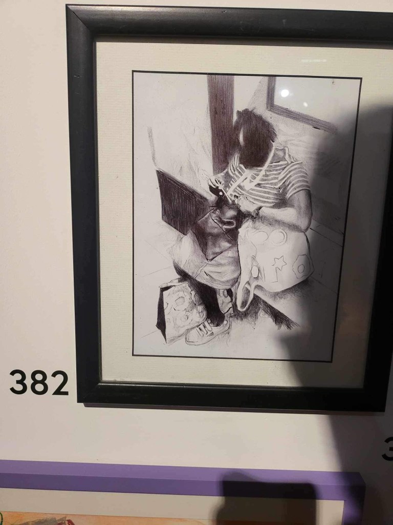 I put one of my pieces in an open exhibition. Leading up to seeing it in there I was a bit meh because I would rather of had something more up to date in the show, even though it was only a few months ago it feels an age ago in terms of ideas and practice. It just felt a bit basic and a bit like an easy image. I draw well, it’s easy to like. It also is a very dark and colourless image. IDK. I was not dreading it or anything. I have been quite down recently though so I might not have been in the best head space.