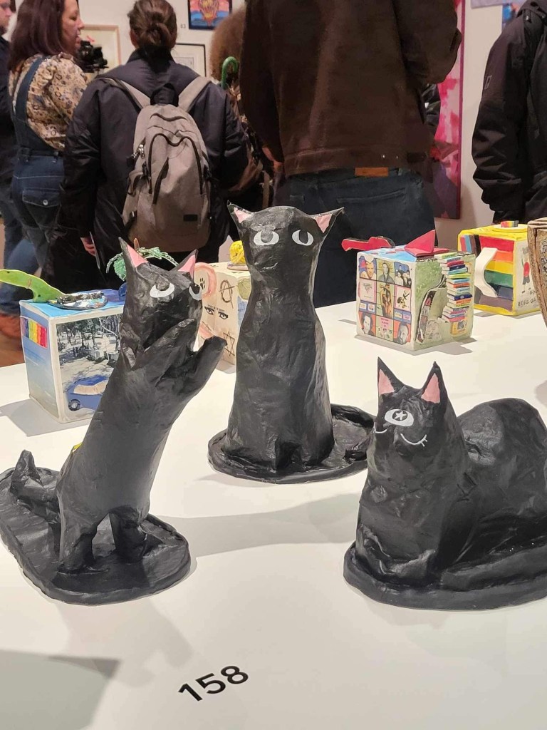 I also often have an emotional delay or do not feel the correct emotions in the moment or protect myself from being open to the moment in case I get hurt. Going in I was congratulated as apparently it was tough competition this year, I felt nothing about that. They gave me a sticker that said artist, I put it on my boob, so no one could see it, but also funny. I had opted not to have my work for sale, but you could buy others. I just figured no one would want it so why bother thinking of a price. I am really not down on myself or my work I just don’t see why others would be interested. This was my way of attempting to work out how to be out in the real world with my work as I have never been before.