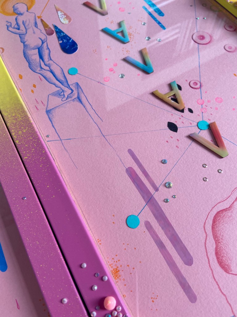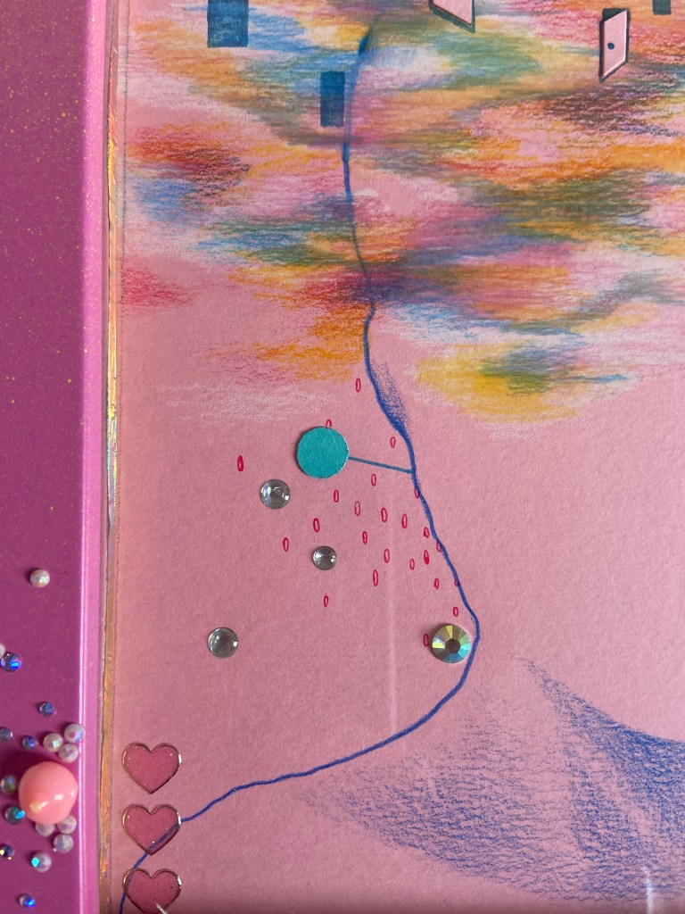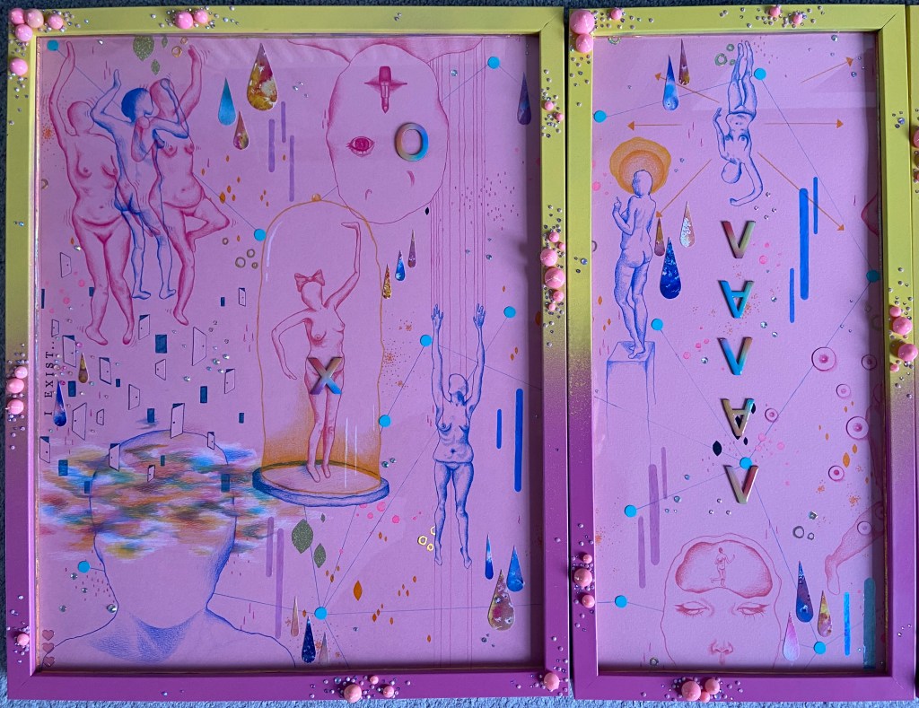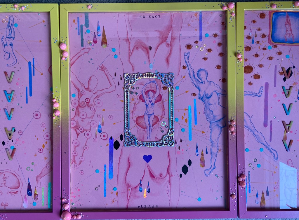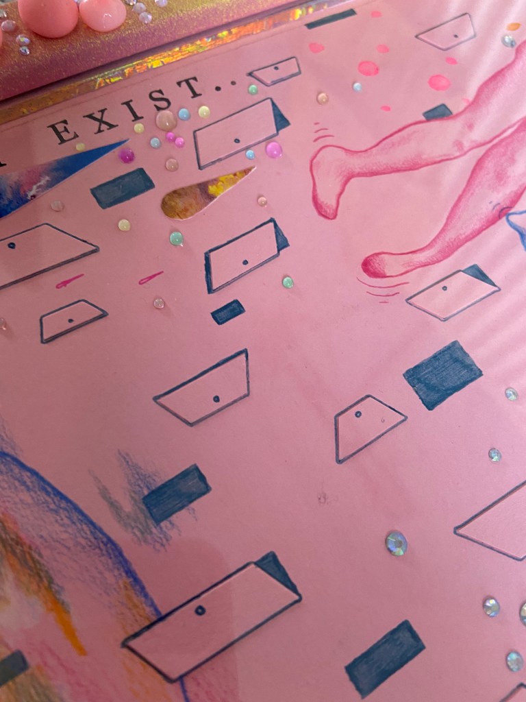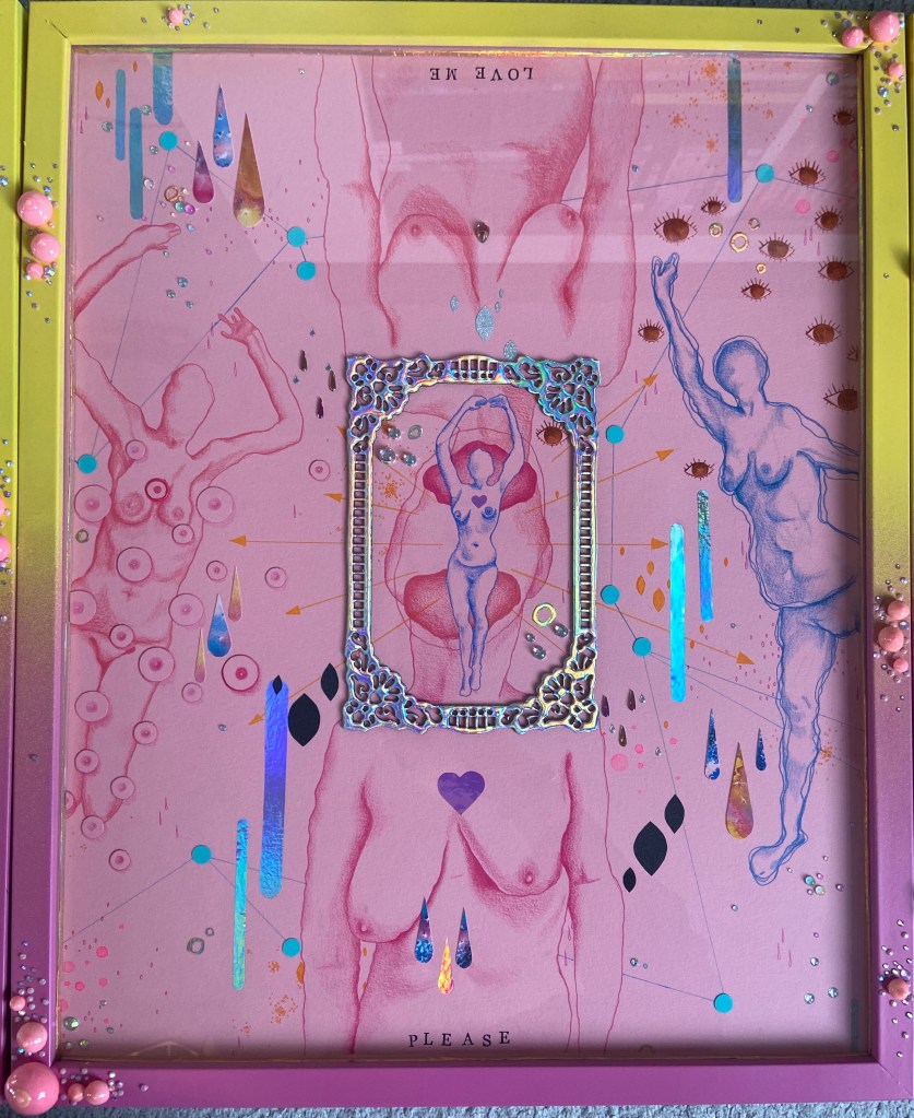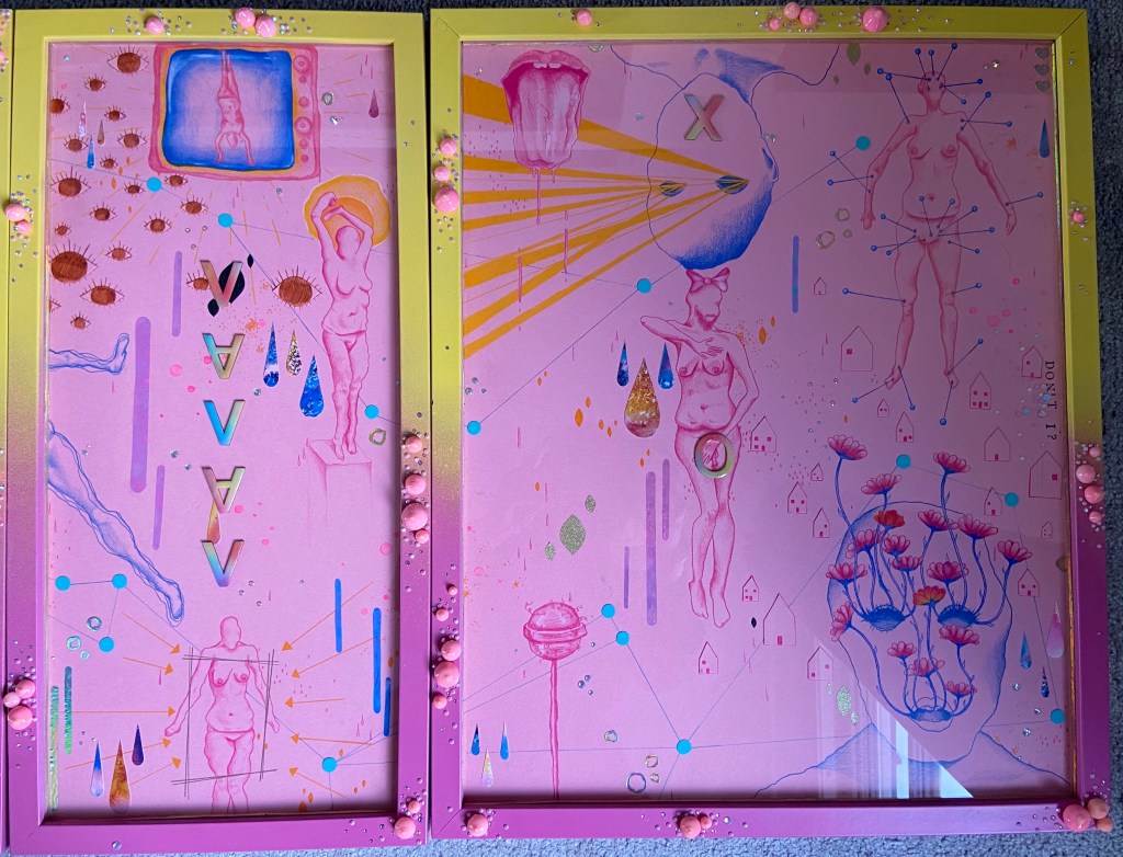 I feel like I tried to an amalgamation of lived experiences and the way I see and interpret the world and how I am seen and all of the bing a woman stuff and I should have just focused on one thing at a time and fully explored and thought about it. The work was not quick enough to be purely instinctive and expressive, and, as I was rushing to get it done, it was not processed enough or through out enough. There are parts of it I like but all together it is so busy and distracting. I could probably find more positives, say it have something to do with the constant nature of being a woman or Adhd.